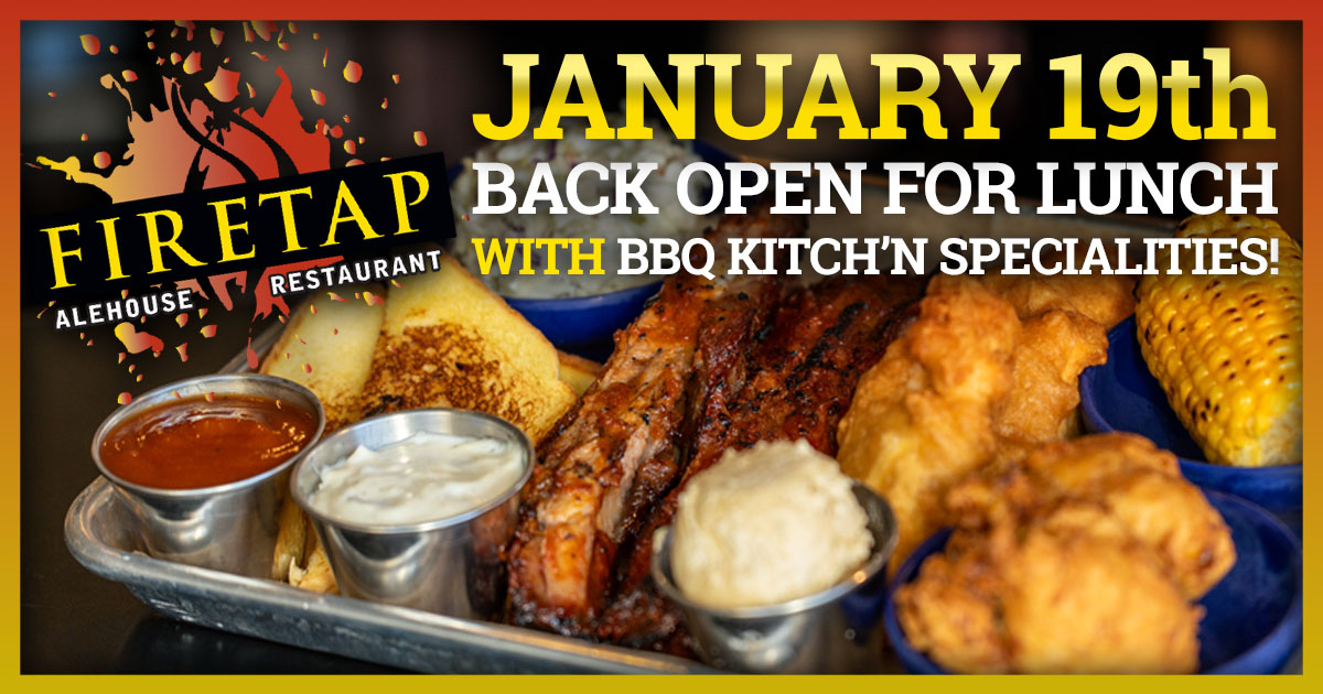 Starting January 19th, Firetap Alehouse is officially BACK OPEN FOR LUNCH, and this time we’re turning up the flavor with BBQ Kitch’n specialties added to the menu!